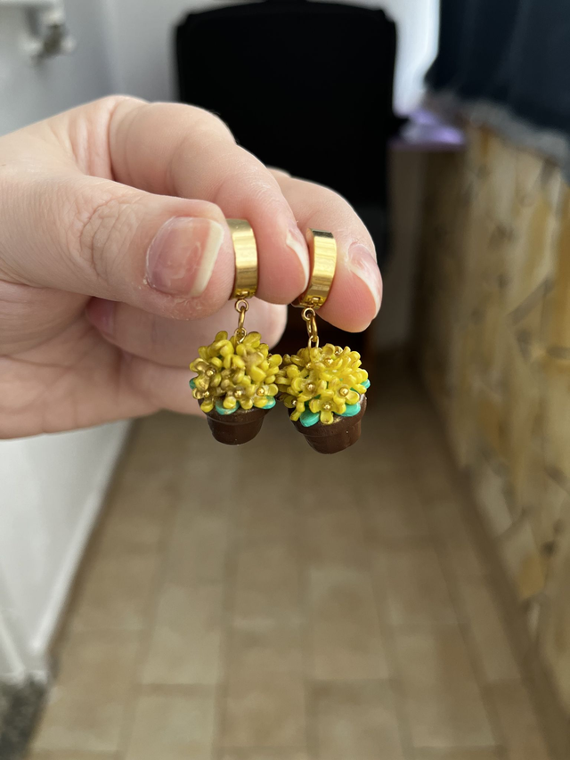 Orecchini gialli con mini bouquet in vaso – fatti a mano