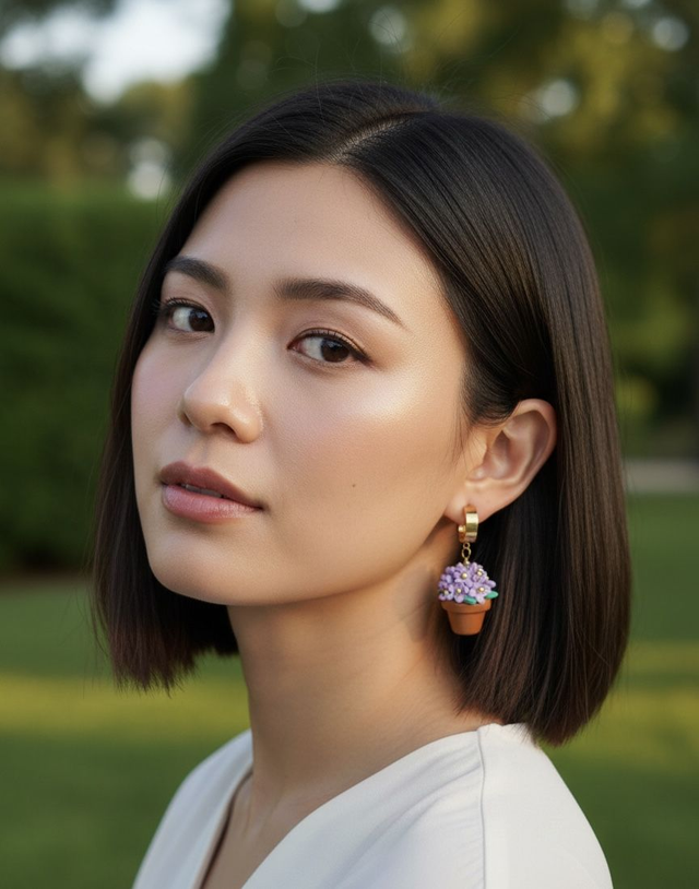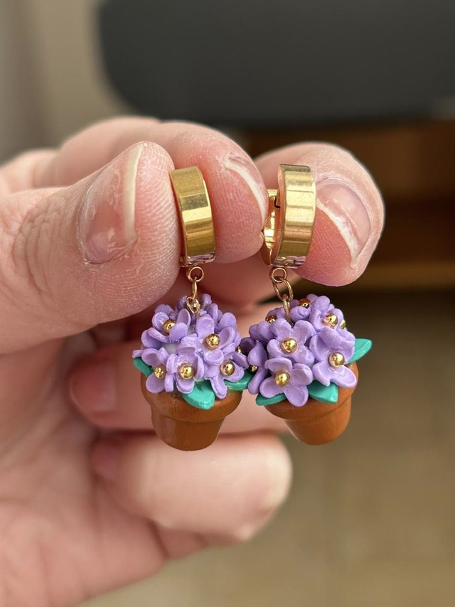 Questi orecchini lilla raffigurano un mini bouquet in vaso, modellato interamente a mano in argilla polimerica. Ogni fiore viola è creato petalo dopo petalo, per un accessorio leggero, originale e ricco di dettagli.